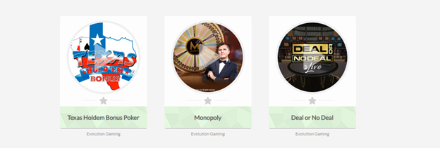 Live Dealer games are provided by Evolution Gaming. Currently, there are three games in this category. These variations are Deal or No Deal, Monopoly, and Texas Hold’em Bonus Poker.